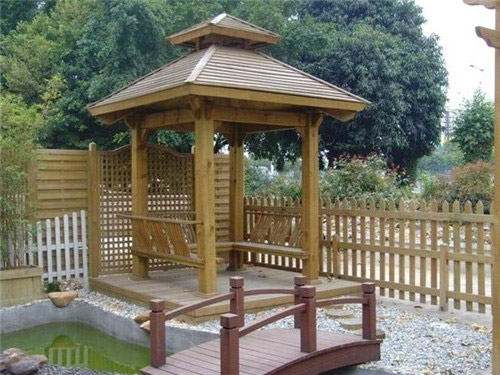 防腐木亭子具有體積不大、用料較少、設計靈活、建筑方便等特點,很適合園林景觀布局的需要。防腐木亭子是在我國園林景觀綠化中運用多的一種建筑形式。無倫是古典園林景觀,還是現代園林景觀中,都可以看到各種各樣豐富多彩的防腐木亭子,屹立于山岡之上;或依附在建筑之旁;或漂浮在水池之畔。以玲瓏美麗、豐富多樣的形象與園林景觀中的其他建筑、山水、綠化等相結合,構成一幅幅生動的畫圖。貴州防腐木亭子成了為園林景觀空間和自然山水增添美色的重要點綴建筑物。防腐木亭子的作用一方面是點綴園林景觀空間、提升環境層次,另一方面是解決人們在旅游休閑中駐足休息,納涼避雨、眺望景色的需要。